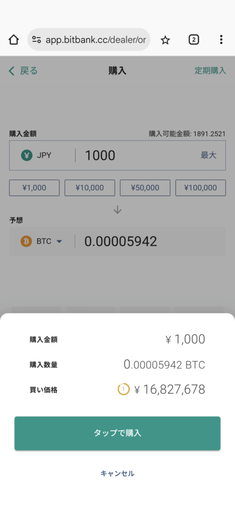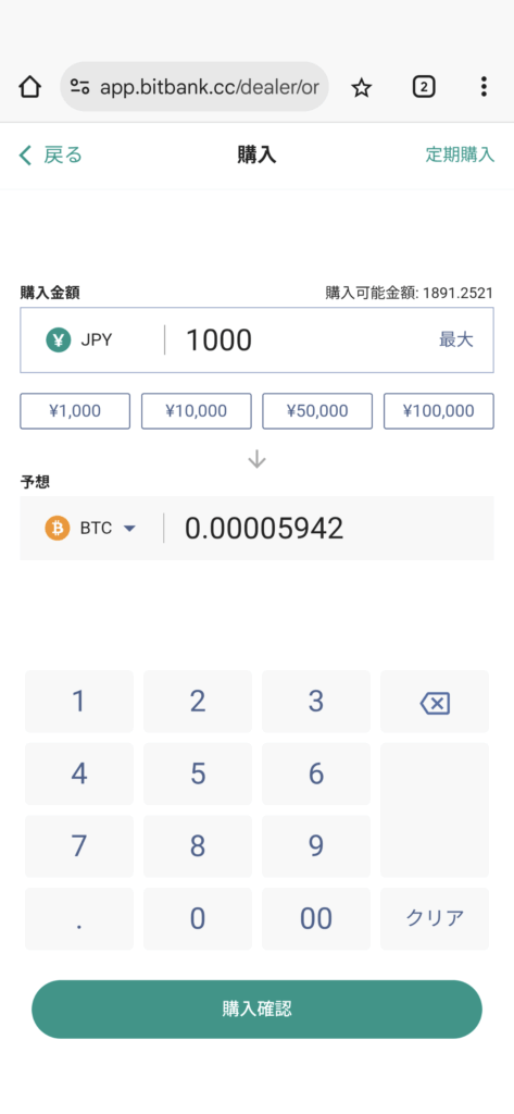 入力すると、数量(買えるBTCの量)と予想購入金額(円換算)が自動で表示されます。