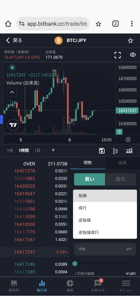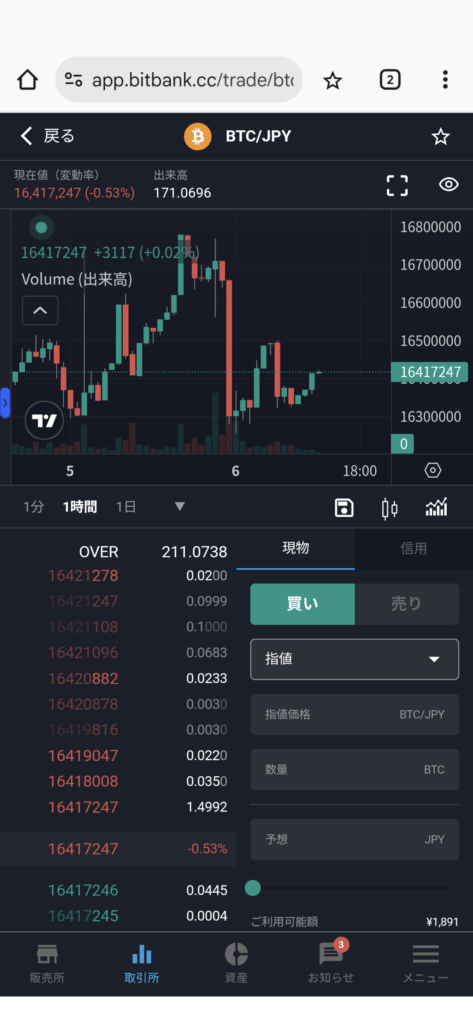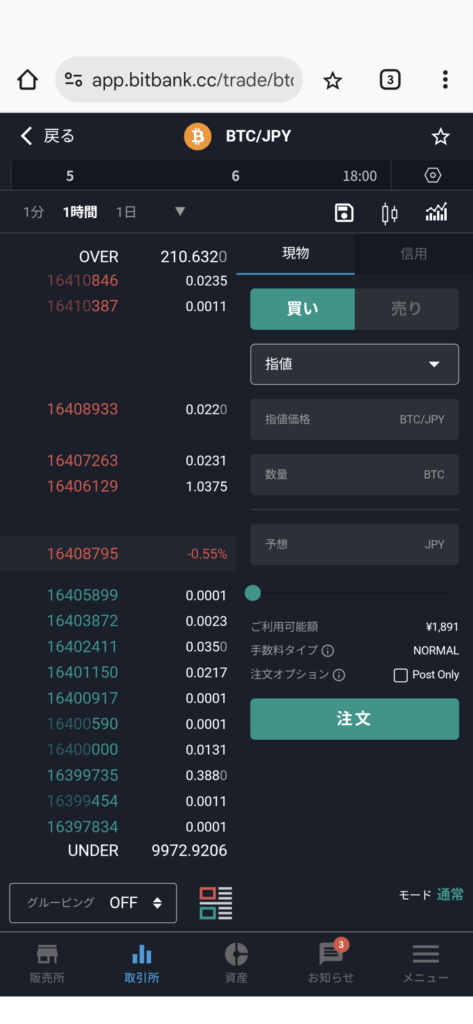 販売所と違って「板(注文表)」が表示されており、ユーザー同士で直接売買できます。